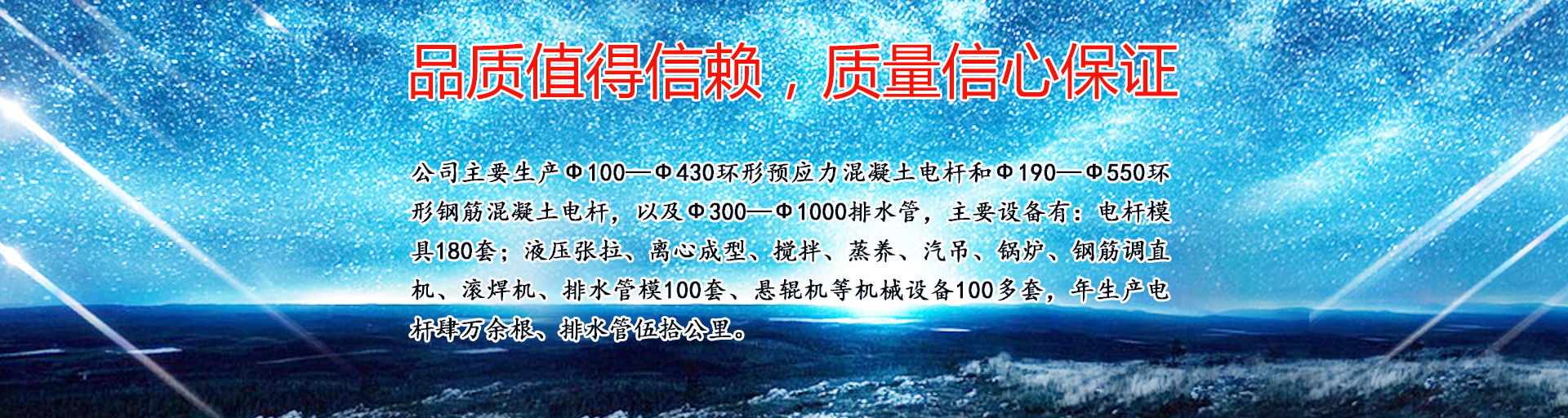 公司主要生產(chǎn)ф100—ф430環(huán)形預(yù)應(yīng)力混凝土電桿和ф190—ф550環(huán)形鋼筋混凝土電桿,以及ф300—ф1000排水管,主要設(shè)備有:電桿模具180套;液壓張拉、離心成型、攪拌、蒸養(yǎng)、汽吊、鍋爐、鋼筋調(diào)直機、滾焊機、排水管模100套、懸輥機等機械設(shè)備100多套,年生產(chǎn)電桿肆萬余根、排水管伍拾公里。……